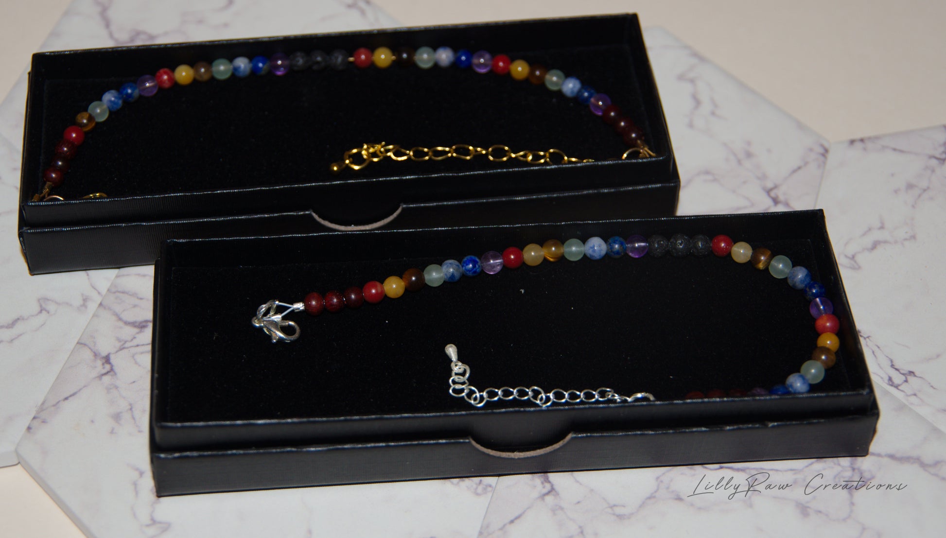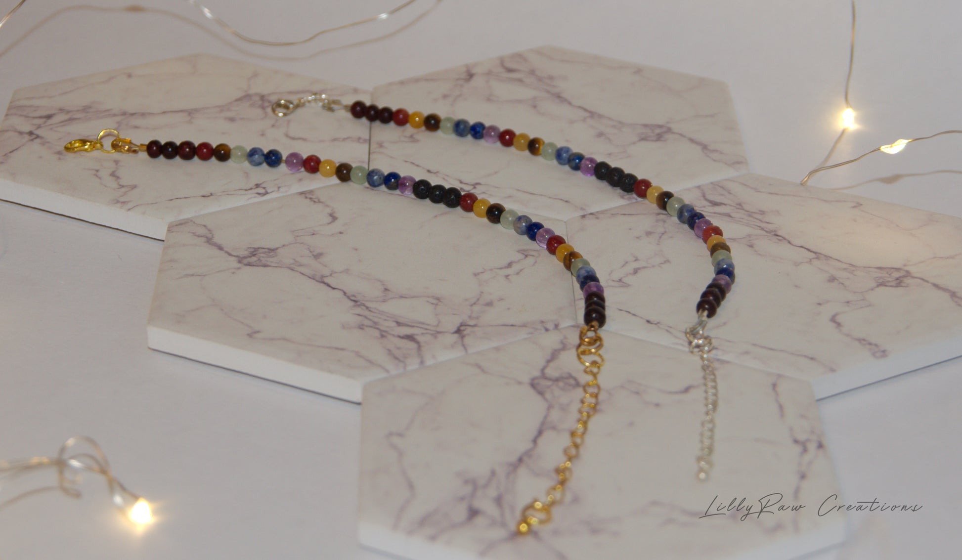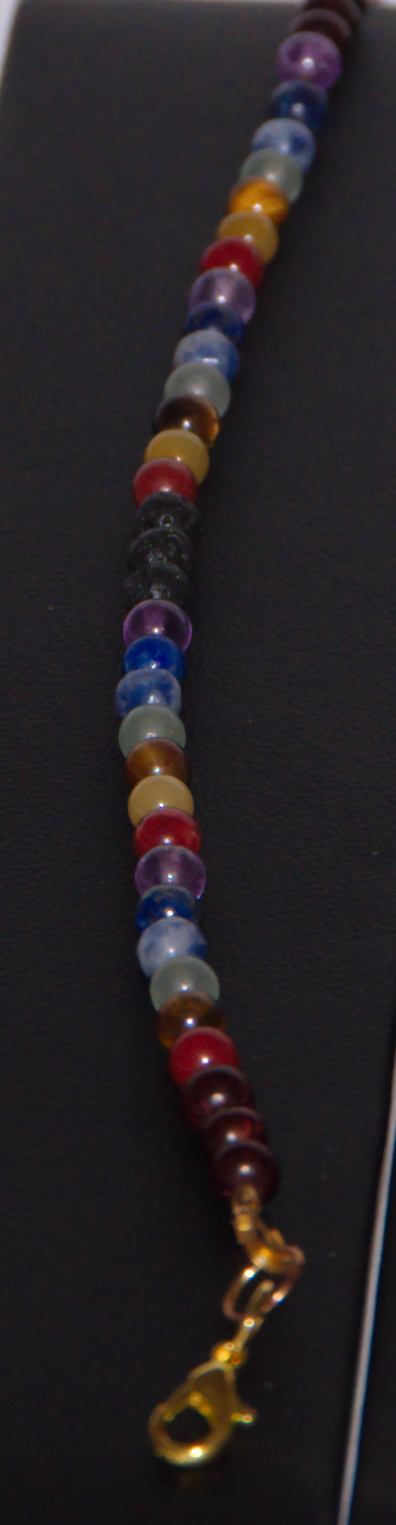 En bref, le jaspe arc-en-ciel rouge, l'œil de tigre, l'aventurine jaune et verte, le lapis-lazuli, la pierre à points bleus et l'améthyste travaillent ensemble pour favoriser l'ancrage, l'équilibre émotionnel et physique et l'harmonie générale.