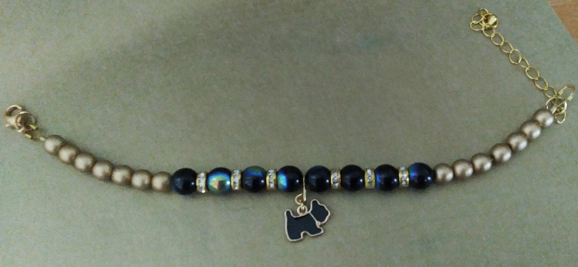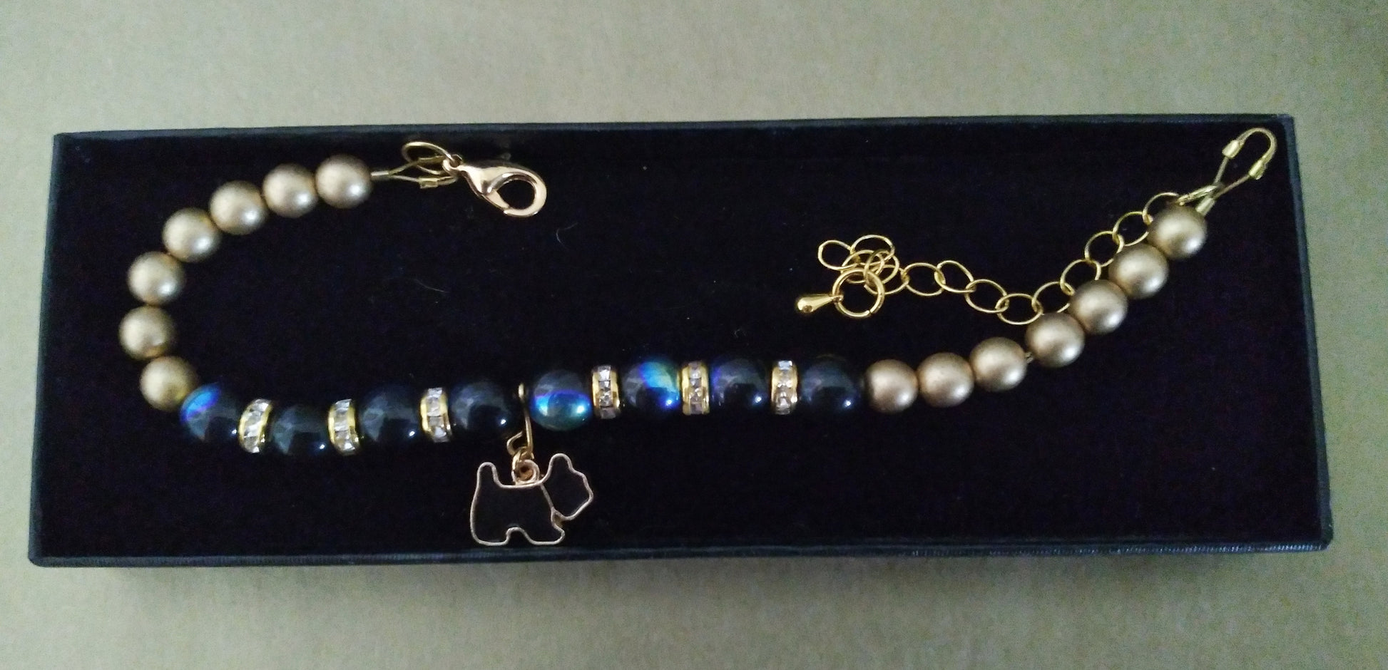 Cet ensemble glamour et adorable de bracelet et de boucles d'oreilles comprend de belles perles de verre tchèque rehaussées d'espaceurs en strass plaqués or (qui ressemblent également à des colliers de chien blingy !). Au milieu du bracelet se trouve une adorable breloque terrier écossais en résine plaquée or qui s'agence parfaitement aux boucles d'oreilles qui l'accompagnent. Si vous êtes un Trekkie comme moi, vous obtiendrez certainement la référence que j'ai utilisée dans le nom de mon produit et je pense que vous apprécierez l'ambiance galactique qui rayonne des perles noires.
