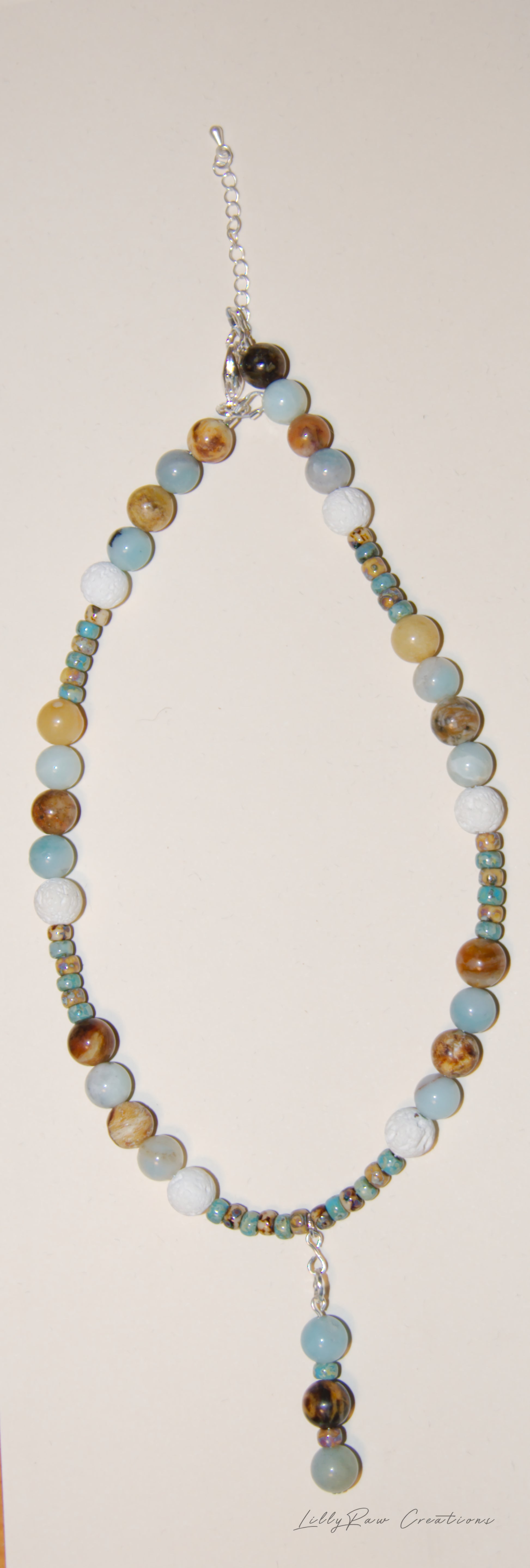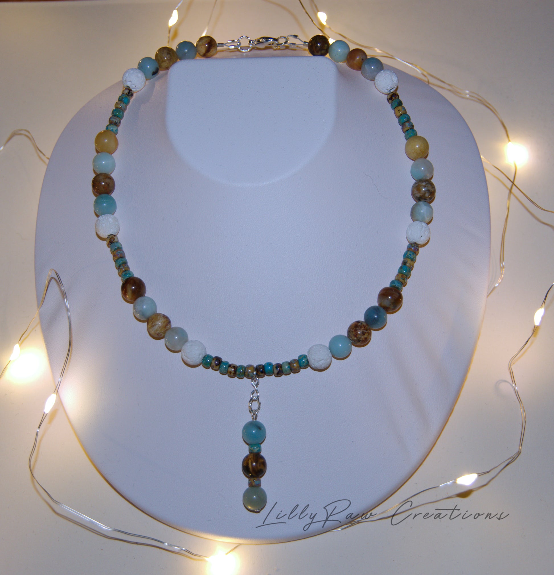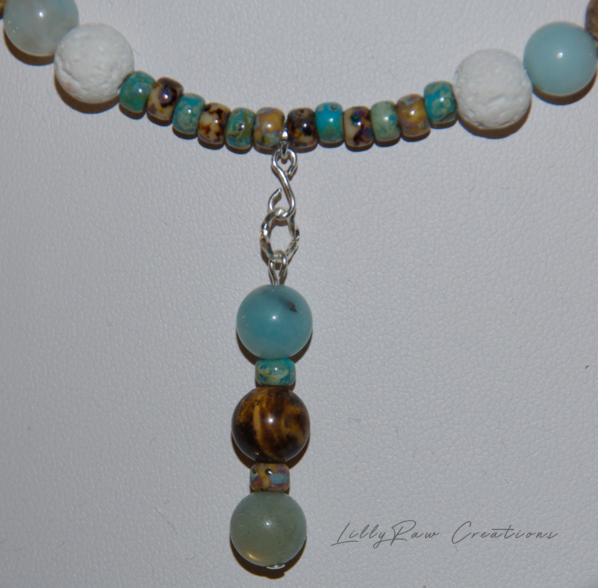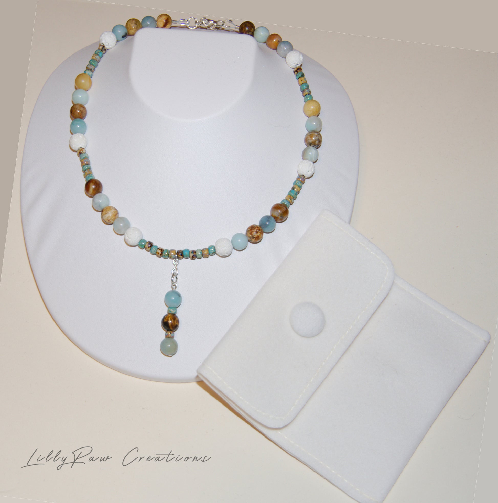 Fier de ma collection Gaia, ce collier ras du cou représente la base solide de la Terre et la variabilité du Ciel. Il présente la dualité yin et yang de la nature. J’ai utilisé des pierres précieuses d’Amazonite multicolore et de Fire New Jade Serpentine ainsi que des perles de lave blanches pour créer la juxtaposition entre la Terre et le Ciel. Les perles de verre japonaises sont un ajout complémentaire. L’avantage supplémentaire d’avoir les perles de lave blanches est que vous pouvez y mettre des gouttes de vos huiles essentielles préférées !
