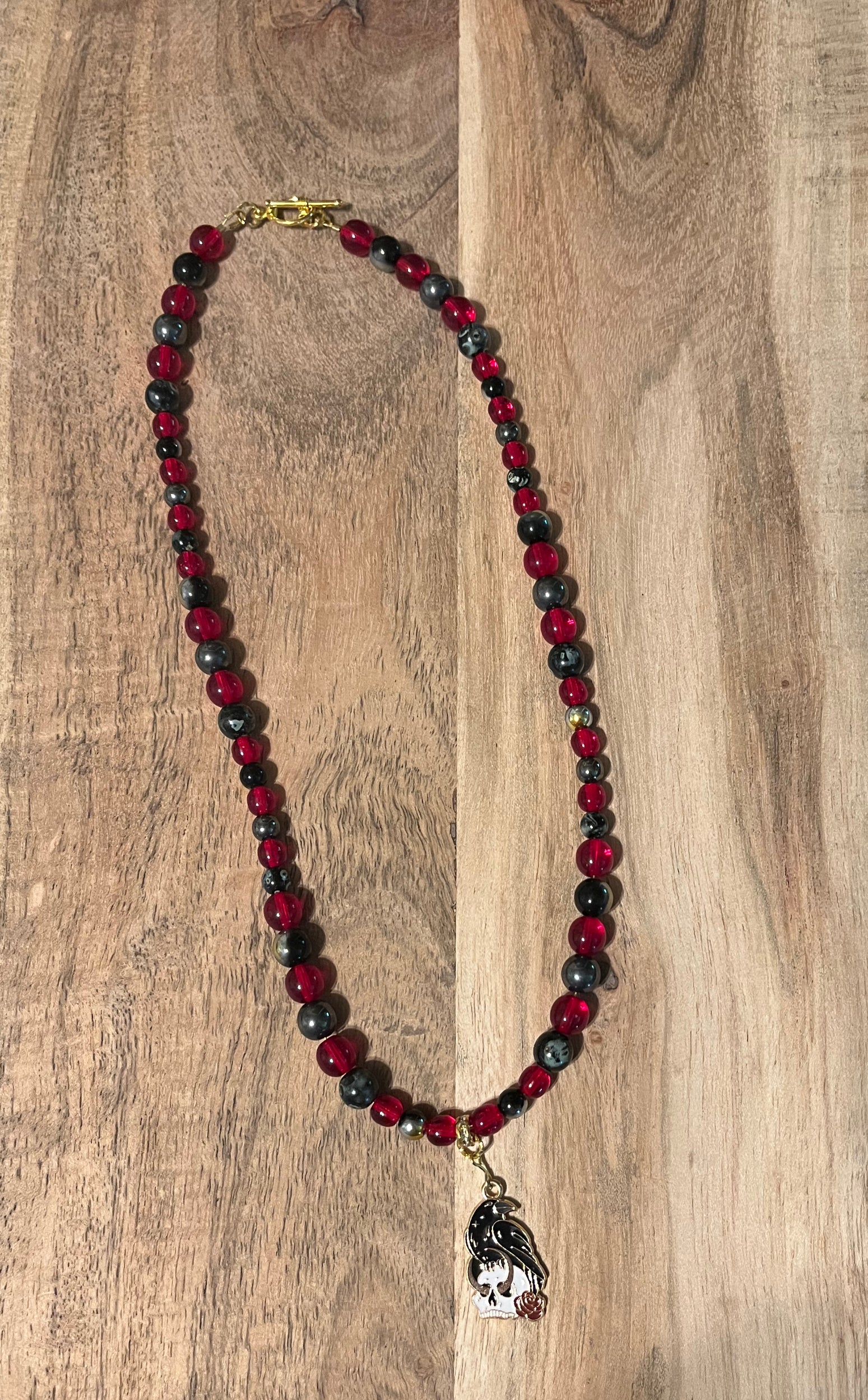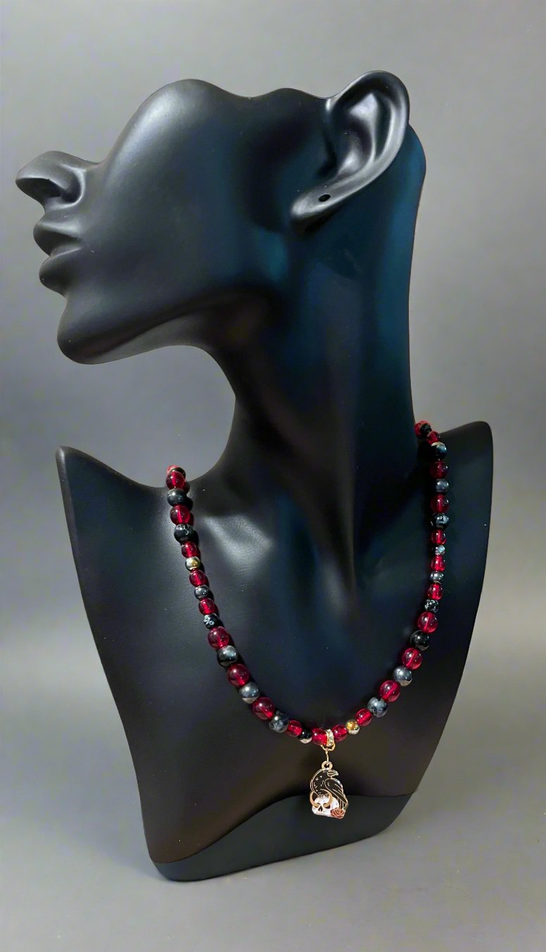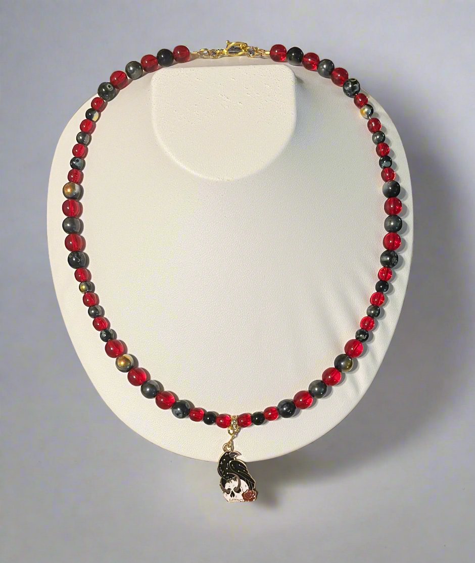 My very first time hearing Edgar Allen Poe's gothic poem The Raven was The Simpsons' first ever Tree House of Horror episode where it was narrated by the brilliant James Earl Jones and it has stuck with me ever since, becoming one of my absolute favourite poems. When I decided to create a collection around books and reading I knew that I had to make a piece honouring The Raven and thus this necklace was born! Featuring 4 different colours and 2 different sizes of Czech glass beads and a gothic resin and gold plated raven charm, this necklace is sure to bring out your spooky side. Unlike some of my other necklaces that have lobster claps and extender chains, this necklace fastens with a gold toggle clasp as I have designed it to be Princess length.